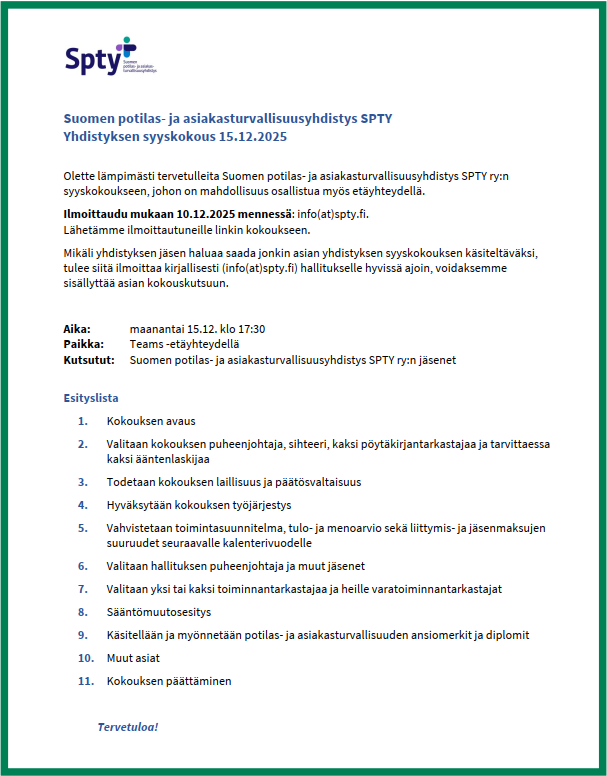 Suomen potilas- ja asiakasturvallisuusyhdistys SPTY syyskokous 15.12.2025 klo 17:30-