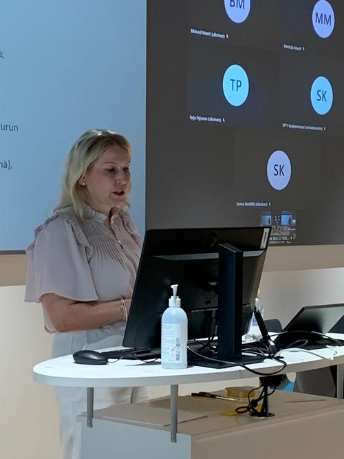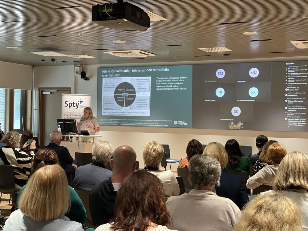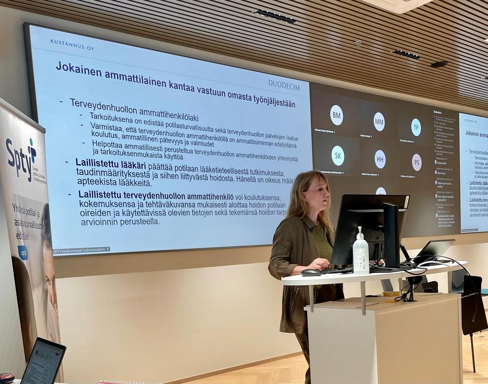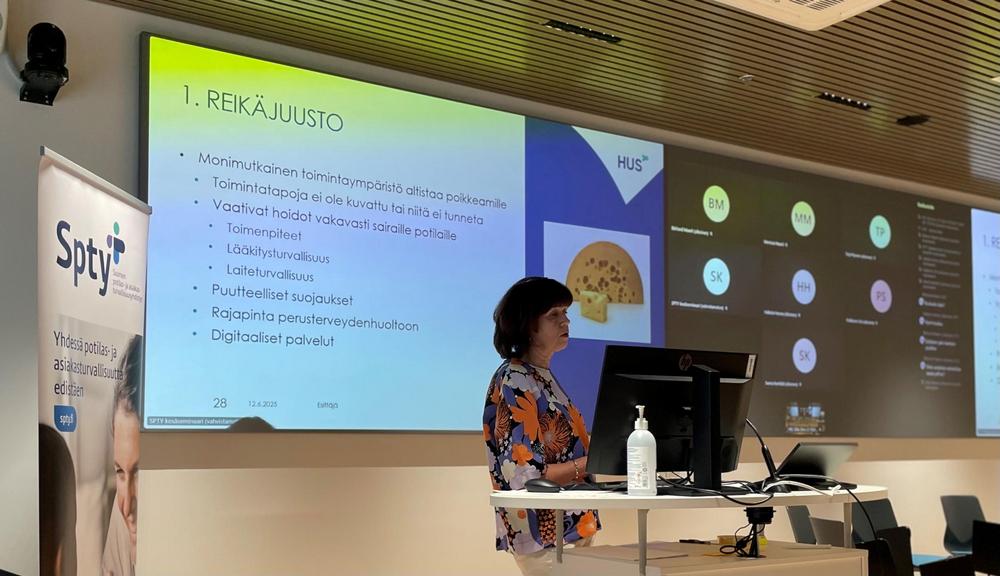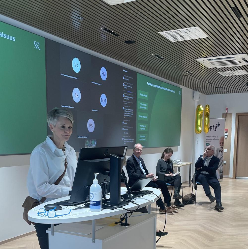 Lounaan jälkeen Asiakas- ja potilasturvallisuuden tulevaisuus -paneelissa oli laaja asiantuntijajoukko katsomassa tulevaan. Ilo oli kuulla myös potilaan, Juhani Kalevin näkökulma oleellisena toimijana. Vierailijaluennoitsijana kuulimme Risk Manager Mark Krasnikia. Sara Kinnunen kertoi tekoälyn mahdollisuudet potilasturvallisuuden parantamisesta nyt ja tulevaisuudessa. Päivän lopuksi kuulimme puheenvuorot Teamcarelta sekä Awanic Oy:lta.