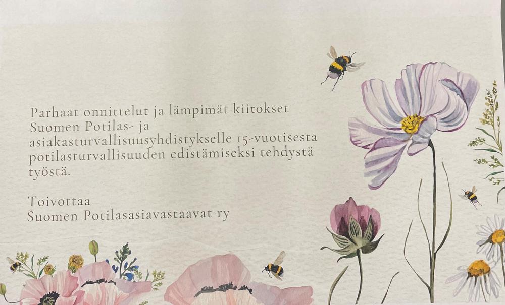 Illallisella yhdistystä juhlapuheella onnitteli vielä Valviran ylijohtaja Markus Henriksson, pohjanmaan hyvinvointialueen johtaja ja yhdistyksen perustajajäsen Marina Kinnunen, Asiakas- ja potilasturvallisuuskeskuksen johtaja Tuija Ikonen sekä hallituksen jäsen Timo Keistinen sekä Suomen Potilasasiavastaavat, jotka onnittelivat sähkeellä.